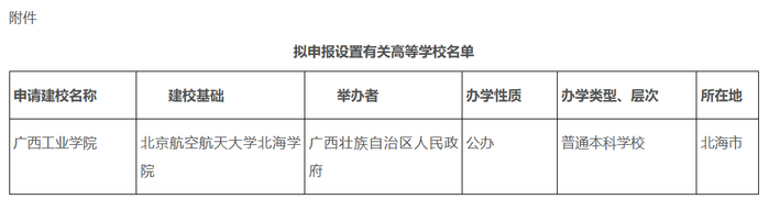 近日,广西壮族自治区教育厅发布拟申报将北京航空航天大学北海学院转设为广西工业学院的公示,办学性质为公办。