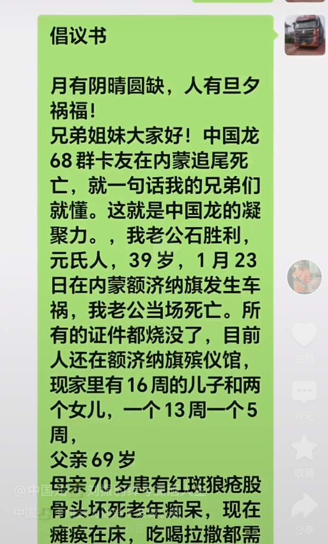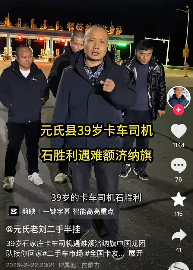 早前,来自河北元氏的39岁卡友石胜利不幸客死内蒙额济纳旗,据知情人士透露,当时的石胜利因为汽车发生意外,所以肉身被烧掉了一半,因为当时正是大年初六,所以他的遗体不得不停放在当地,直到22号晚,支援的卡友才开始行动。