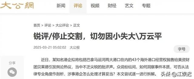 文章还警告,如果交易完成,中国的物流成本将大幅上升,制造业竞争力也将被削弱。3月21日,《大公报》再次发声,发布题为《停止交割,切勿因小失大》的社评。
