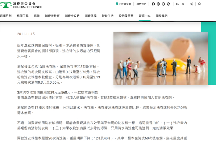 2011年11月,香港消费者委员会公测试了香港市面上三款洗衣球对上17种常见污渍的去污效果,对比了清水、洗衣粉、洗衣液和洗衣球的洗涤效果,最终证实这些洗衣球的去污功效与只用清水洗涤没有区别。
