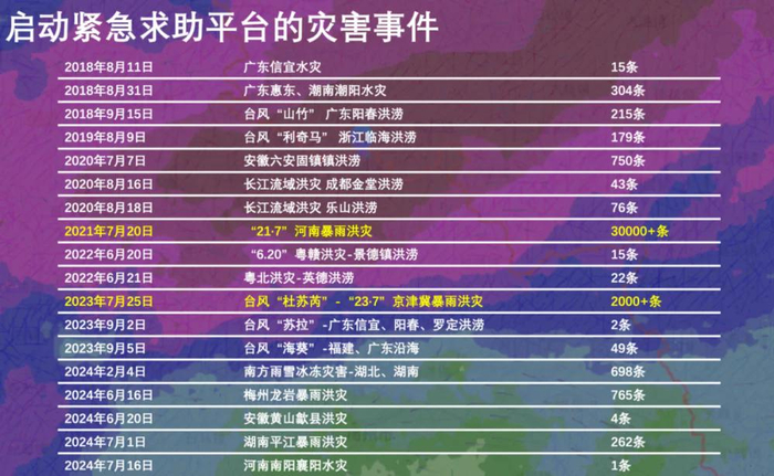 这样的紧急求助平台,我们已经在将近20次的灾害事件当中实践过了,其中最为人知的是在2021年河南水灾和2023年京津冀暴雨洪灾当中。
