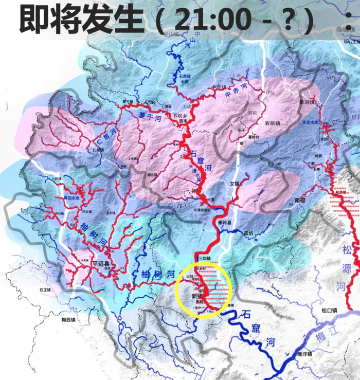 除了新铺镇以外,在其他的河流下游也有类似的情况,比如说在松源镇和茶阳镇,都可能有这样大量人员被洪水围困的情况的发生。