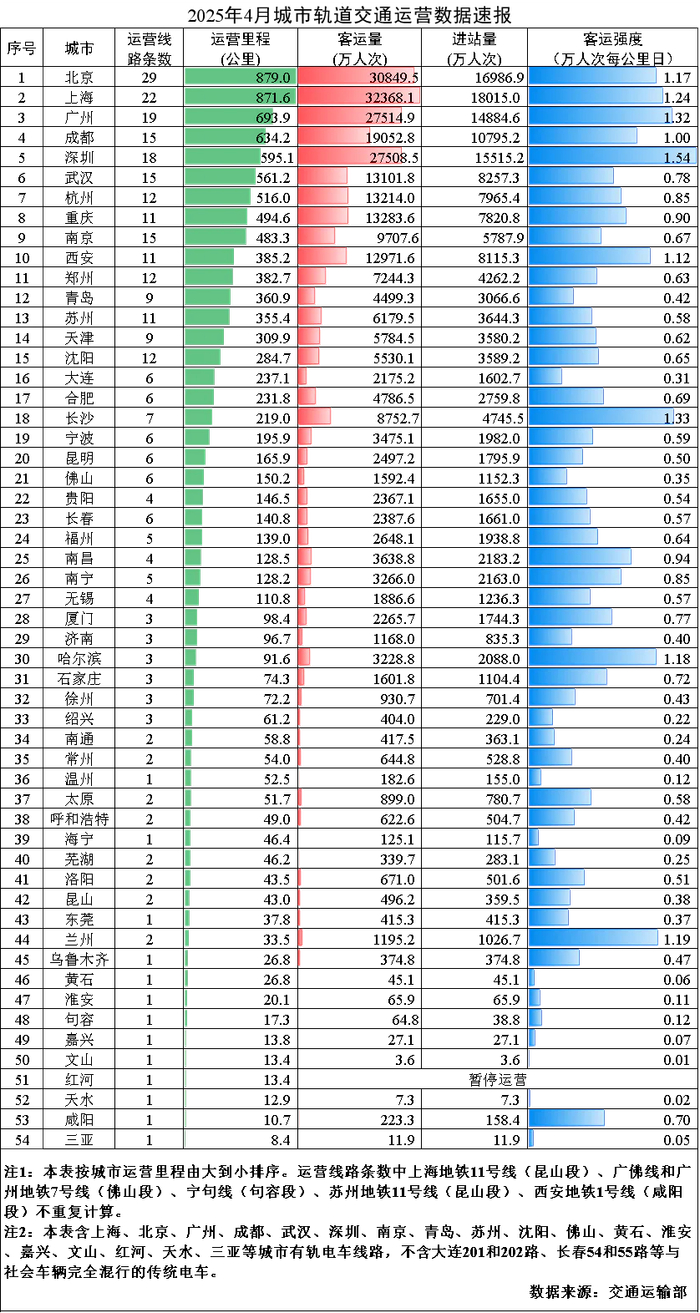 在所有城市中,只有9座城市客流强度超过1万人次/公里日:深圳、长沙、广州、上海、兰州、哈尔滨、北京、西安、成都。