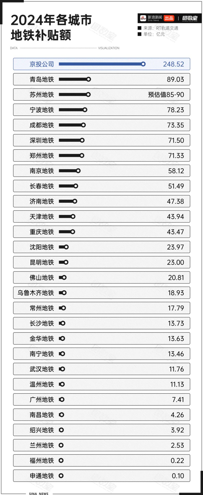 据图数室统计,各大城市地铁补贴总额超千亿,最高的北京多达248.5亿,郑州、深圳、成都、宁波、苏州、青岛等也超过70亿。