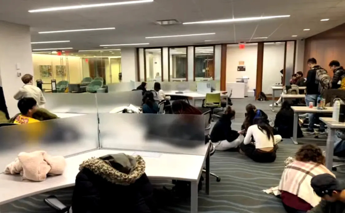 几分钟后,全校同学都收到了学校群发的枪击警报。中国留学生@EM电磁波躲在宿舍房间内,听到警车呼啸而过,红蓝光线炸亮了漆黑的房间,直升机从深夜盘旋到早上,发出“嗡嗡”的声响。