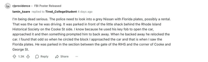 一位化名为约翰的发帖人用严肃的语气提醒道:“警方应重点关注一辆挂着佛罗里达牌照的灰色日产轿车,它很可能是一辆租来的车辆。”(这辆车,在后面还会出现)
