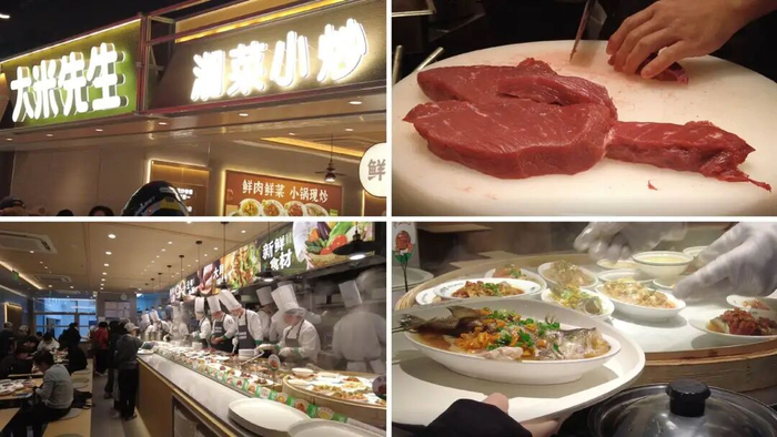 门店开业首日午间,内参君前往朝阳长楹天街东区B2层,门头上标着大米先生·湘菜小炒,菜品定位一目了然,开放式门店布局,里面是快餐店最流行的明档亮厨,现场一片烟火气升腾。