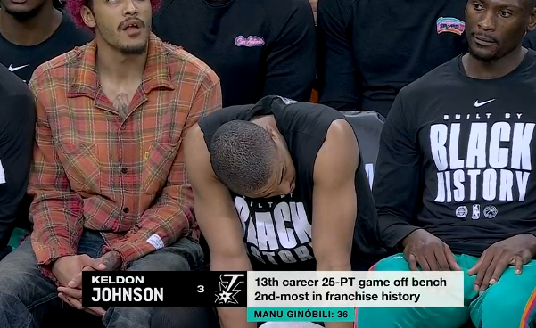 凯尔登生涯第13次替补出战砍下25分,马刺队史第二多仅次于吉诺比利36次。