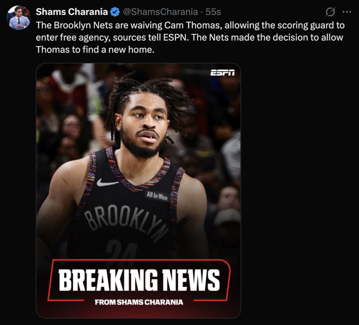 北京时间2月6日,据名记Shams报道,篮网将球队后卫托马斯裁掉,篮网此番是为了托马斯可以在自由市场里寻找更好的下家,他将成为买断市场的头号热门人选。
