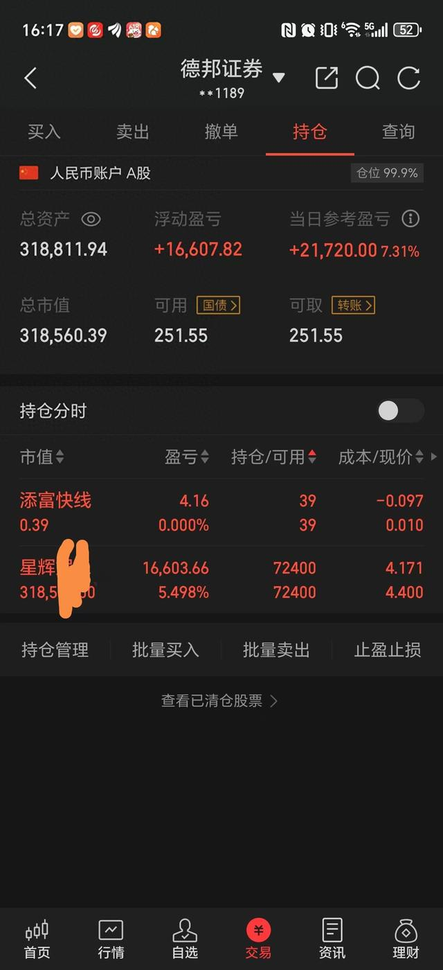 目前持有星辉(300043),昨天复盘笔误,把星辉说成了富春(富春也不可能有-4%点几那价格哈)。今天早盘前判断预计-1%左右开盘,大概8%左右收盘,最终确实与预期差不多,确实是-0.94%开盘,收盘+7.32%。