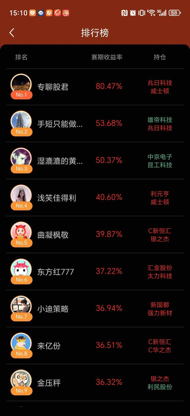 今天的模拟盘大赛持有威士顿和兆日科技,都是互金方面的题材票。还有两天比赛结束,按预期的话,持有这两票不动就应该可以赢得本个月的大赛了。目前模拟盘(6.6-6.25期间)的收益已经达到80.47%,仍居第一名。
