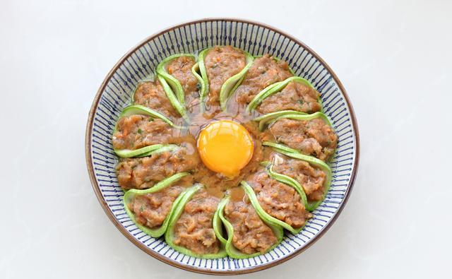 6.包好的肉糜呈放射状排放盘中,中间放一勺肉糜整理成小坑,打个鸡蛋进去。