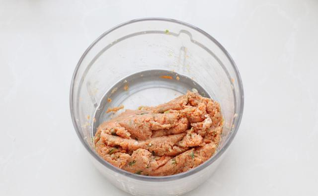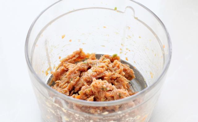 2.将猪肉、胡萝卜和葱花一同放进料理机内,搅拌成肉糜状态。