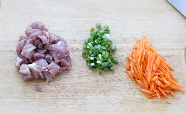 1.猪肉洗净切成小块,胡萝卜切碎,小葱切葱花。