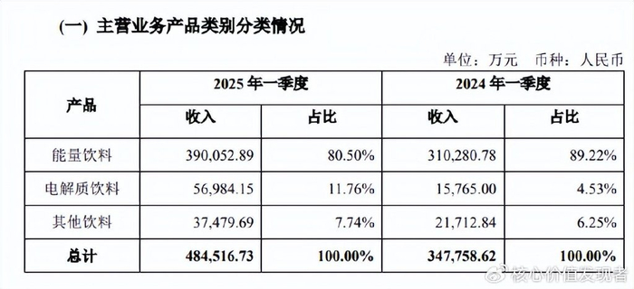 业绩保持增速的同时,东鹏饮料产品单一性问题仍未解决。东鹏饮料同日披露的《2025年第一季度主要经营数据》显示,主营产品收入中,能量饮料、电解质饮料、其他产品收入占比分别为80.50%、11.76%、7.74%,尽管电解质饮料占比从上年4.53%提升至11.76%,但核心产品单一性矛盾依然突出。