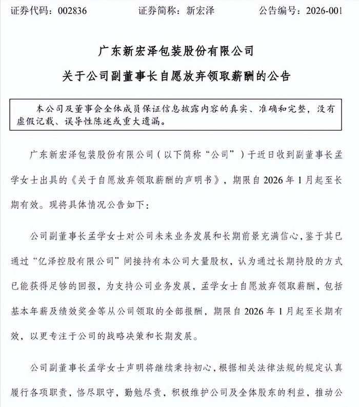 近日,位于广东省潮州市的上市公司新宏泽,发布的一则公告引发关注。副董事长孟学女士主动提交声明称,“自2026年1月起自愿放弃领取全部薪酬,且长期有效”。