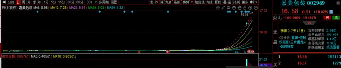 其次是嘉美包装,复牌后股价一字涨停,报16.58元/股;停牌前更是在13个交易日内大涨超230%。