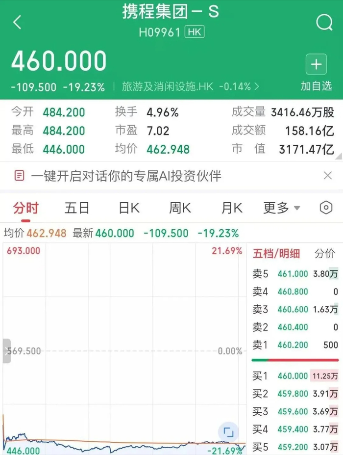14日当天,携程港股尾盘直线跳水,收盘重挫6.49%,报收569.5港元/股。