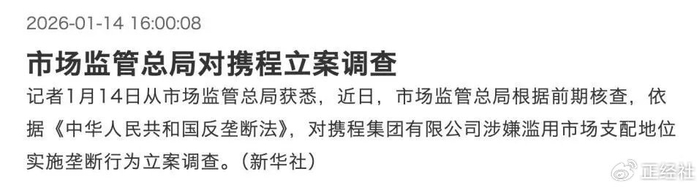 股价跳水最直接的导火索,是1月14日市场监管总局发布的立案调查公告。公告明确,依据《反垄断法》,对携程涉嫌滥用市场支配地位实施垄断行为启动调查。