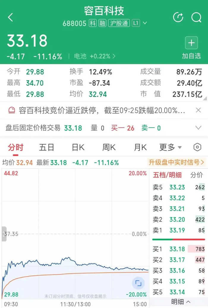 1月19日,有着“锂电第一股”“三元正极一哥”等雅称的容百科技,在刚刚抛出了一份1200亿元锂电大单的“重大利好”之下,开盘后直奔跌停,最终报收33.18元/股(前复权),跌幅为11.16%。