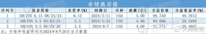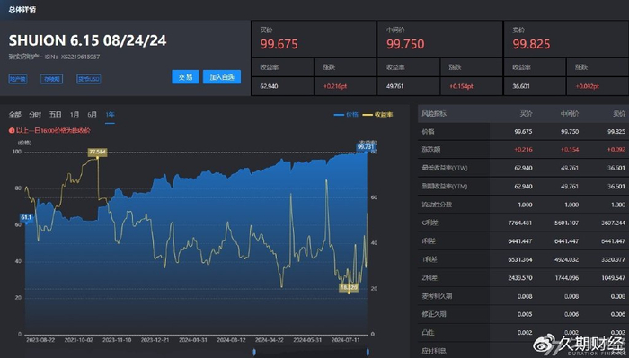 据久期财经网站数据显示,该公司的美元债SHUION 6.15 08/24/24即将到期。在7月期间,有消息称,瑞安房地产在与摩根大通和瑞银讨论美元债管理的相关事宜。从SHUION 6.15 08/24/24近期持续走高的价格曲线来看,市场对其安排兑付到期美元债的信心较强,目前中间价报99.588。据久期财经的活跃债券版块显示,该债券自7月1日至今的交易量达到了1225万,平均成交价逾98。