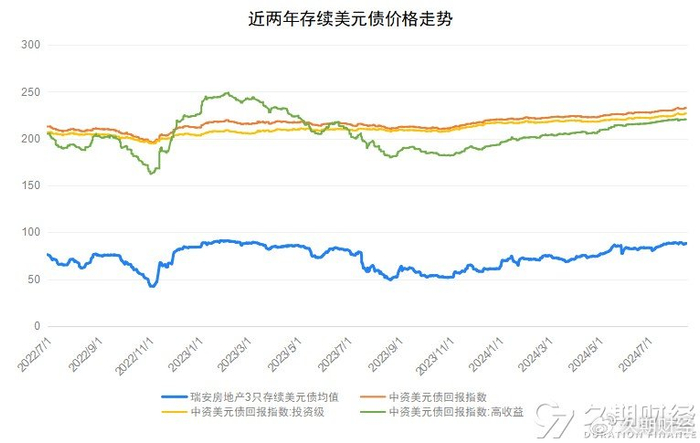 目前,该公司尚有3只存续美元债,未偿余额近14亿美元。从这3只存续债券的过往的价格曲线来看,瑞安房地产的美元债价格涨跌主要受地产行业的波动影响。