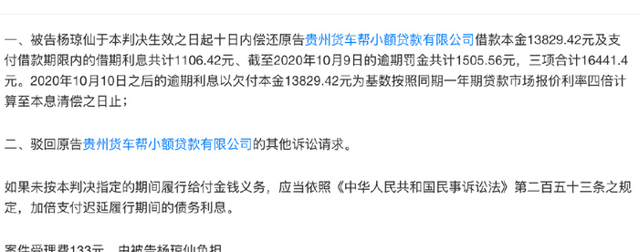 中国裁判文书网也揭示了满帮贷款的真实利率,多篇关于贵州货车帮小额贷款有限公司(以下简称“货车帮小贷”)相关的裁判文书显示,满帮集团旗下货车帮小贷发放年利率36%的“高利贷”,且合同约定逾期加收年利率36%的罚息。