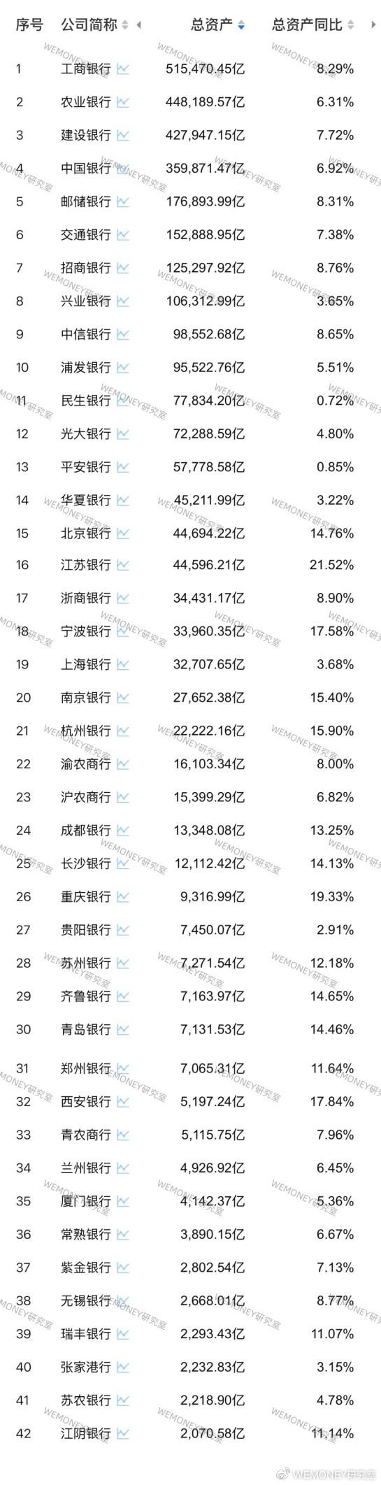 一季度,42家A股银行总资产全部实现正增长。其中,有15家银行总资产保持两位数增长,其中,江苏银行总资产增幅达21.52%,重庆银行、西安银行、宁波银行、杭州银行、南京银行资产增幅超15%。