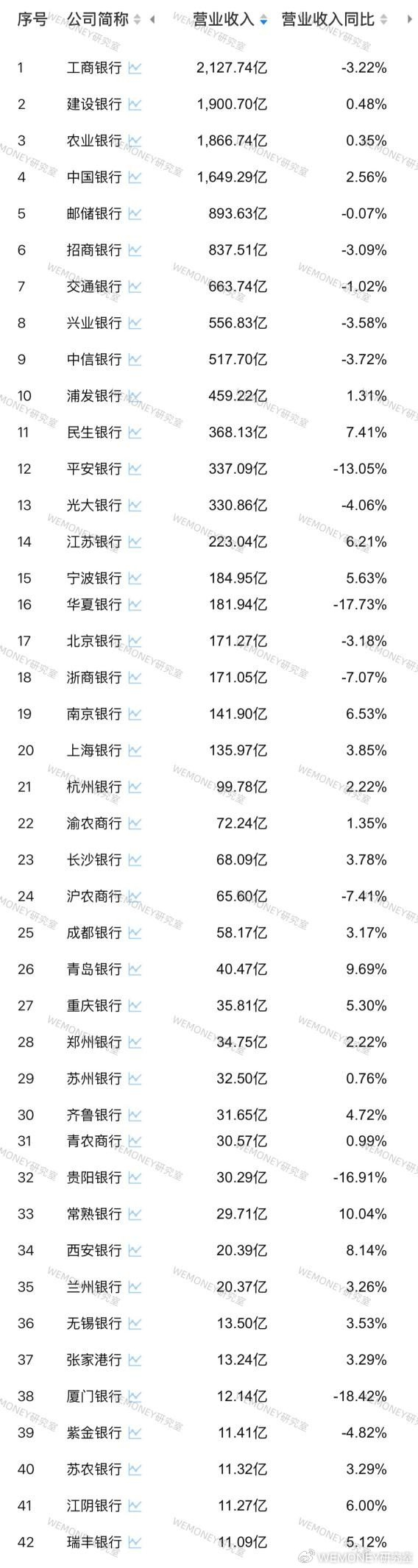 从营收增速来看,有15家银行营收同比下降。其中,厦门银行营收同比下降达18.42%。营收正增长的银行中,仅常熟银行保持10.04%的增速,其余银行营收为个位数增长。
