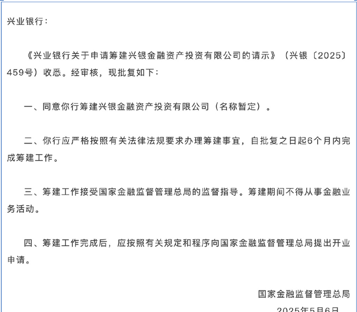 稍后,国家金融监督管理总局就发布关于筹建兴银金融资产投资有限公司的批复,同意兴业银行筹建兴银金融资产投资有限公司(名称暂定)(即兴银AIC)。监管指出,兴业银行需严格按照有关法律法规要求办理筹建事宜,自批复之日起6个月内完成筹建工作。