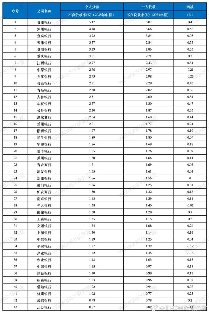 从数据来看,截至2025年上半年末,只有6家银行的个贷不良率较上年末下降,有16家银行的个贷不良率在2%以上,有6家银行突破3%。
