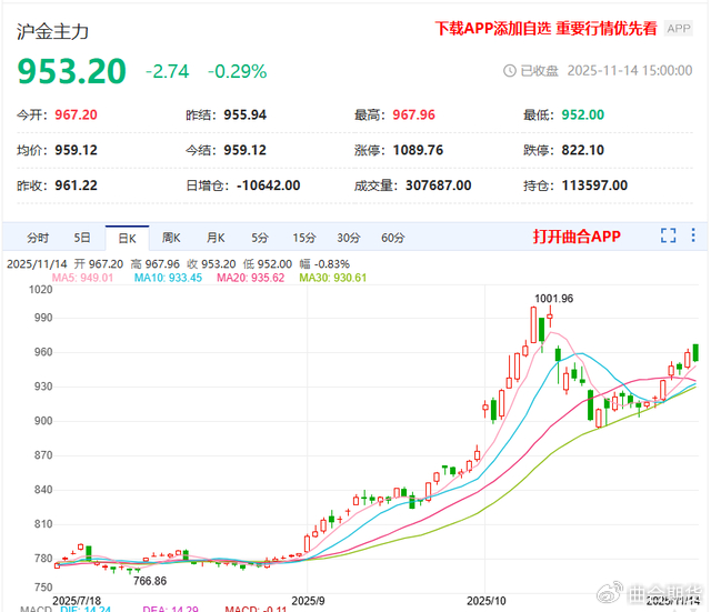 沪金日内收盘下跌0.29%,报收953.2元/克。