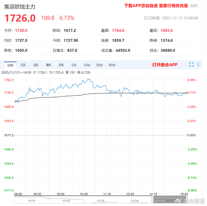 11月17日收盘,集运欧线主力合约上涨6.73%,收于1726.0点。当前市场对12合约的博弈焦点集中于航司宣涨次数及最终兑现幅度。考虑到当下发运逐步上行,而11月末至12月初供应偏紧,预计会出现一定甩柜,12月上旬运价上涨预期仍在,但12月下旬运力偏高,且若月初宣涨落地水平较高,可能吸引加班船的投放,该时段再次宣涨的可能性较低。因此在当前预期下,12月合约难以给予较高估值,进入震荡走势。当前市场对12月宣涨信心有限,02合约承载1月旺季预期博弈。期价随资金博弈波动,建议谨慎操作。