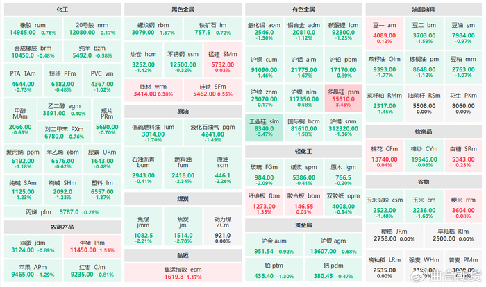 有色金属板块,多晶硅涨超3%,工业硅跌超3%,沪铜、沪铝、沪锡、氧化铝、碳酸锂跌超1%。