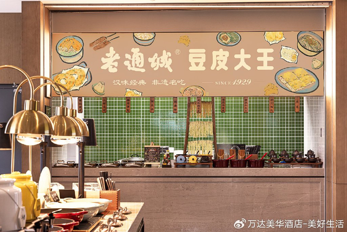 武汉的武汉万达颐华酒店,围绕 “荆楚记忆・千年遗珍,烟火江湖・热辣滚烫” 的主题展开特色服务。酒店楼下便是江汉路,步行可达江汉关,方便宾客日游英雄城市,夜赏繁华江景。饮食方面亮点频出,“蛮有味,饮食颐华”,不仅请文化人吃雪糕,响应黄鹤楼 “背诗免票” 活动,在夏季推出亲子类互动机制,18 岁以下学生背出三首黄鹤楼相关古诗词,就能获得网红黄鹤楼雪糕;还打造地道过早体验,引入业主自有网红餐饮店内爆款豆皮单品,让宾客不出门就能品尝到热干面、豆皮等武汉特色早餐。