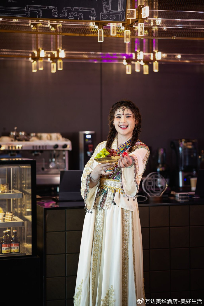 花式打卡环节,民族服饰旅拍备受青睐,让宾客留下极具民族特色的美照。而沉浸入住体验更是独特,参照喀什古城开城仪式,每天早 10 点和晚 6 点,酒店的宾客服务员、经理以及客房服务员会在共享空间跳一段 10 分钟的民族舞蹈,舞蹈结束后为客人奉上端庄的属地特色茶饮。