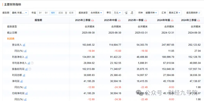 进入2025年,海南银行的业绩颓势并未得到遏制,反而呈现加速下滑态势,形成年内业绩"三连降"的尴尬局面。一季度数据显示,该行营业收入同比下滑19.6%,净利润下滑幅度更高达22.5%,迎来"开门黑"。半年报进一步印证了经营压力,上半年实现营业收入11.46亿元,同比继续下滑15.6%,净利润仅3.05亿元,同比下滑幅度扩大至24%以上。三季报数据则显示,海南银行的营收同比减少18.9%至16.38亿元,净利润同比减少12.6%至4.12亿元,结合前三个季度的下滑趋势及行业环境,海南银行今年全年营收利润双降恐怕已成定局。