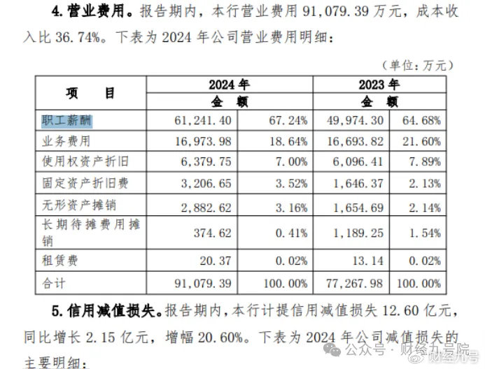 值得关注的是,在业绩持续下滑、资产质量恶化的背景下,海南银行的薪酬支出却逆势增长,引发市场争议。2024年年报显示,该行职工薪酬从2023年的49974万元(1277人,人均39万)增至约61241万元(1317人,人均46.5万),增加1.13亿元,整体涨薪幅度约22.6%,人均涨超7万元;