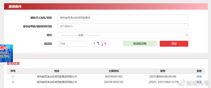 其中,持股0.97%的股东贵州省梵净山投资控股集团有限公司成为风险敞口最大的主体,该公司在2025年多次被法院判定为被执行人,累计执行金额高达9.8亿元,目前已被列入失信被执行人名单。更为关键的是,其持有的贵州银行1.42亿元股权份额已在2025年8月被司法冻结,股权冻结不仅意味着该股东的资本实力受损,也可能影响贵州银行的股权稳定性及潜在融资能力。