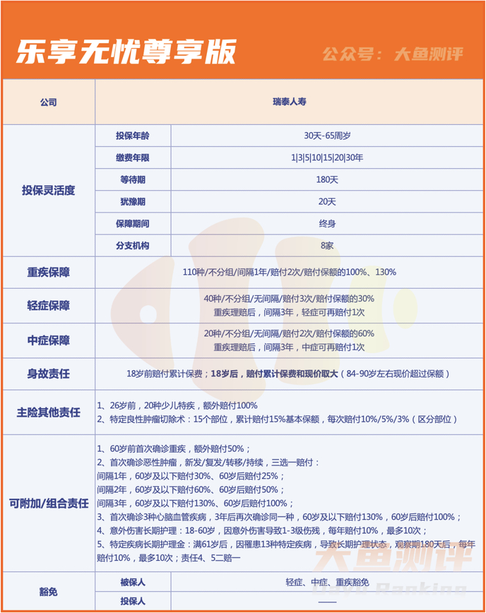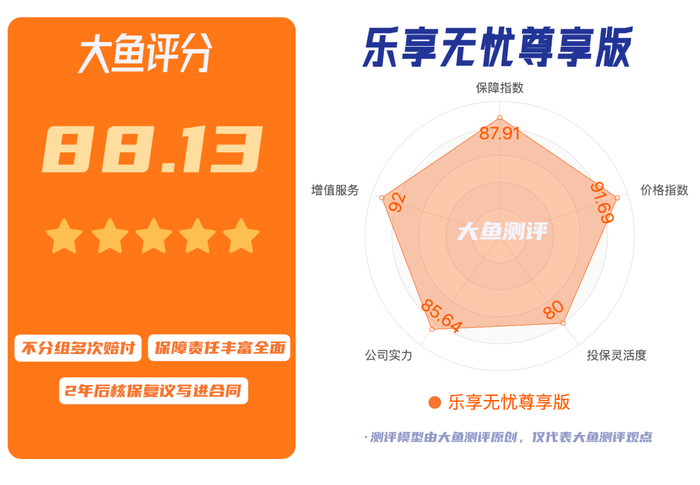 乐享无忧尊享版由瑞泰人寿保险股份有限公司承保。保障指数、价格指数、增值服务等表现均衡且优质。这款产品在大鱼的2.0测评系统综合得分为88.13,给予5星评级,乐享无忧尊享版,作为重疾不分组多次赔付产品,责任规划合理实用覆盖全面,不同年龄段都有可以选择兼顾额外赔付保障,赔付条件灵活且宽松。少儿特疾、逆向赔付、癌症二次、长期护理等责任都是乐享无忧尊享版的优势责任。虽然身故责任的赔付标准有变化,但在同类型产品中,依然值得推荐,适应人群广泛,适合看重多次赔付又想兼顾丰富责任和服务的消费者。