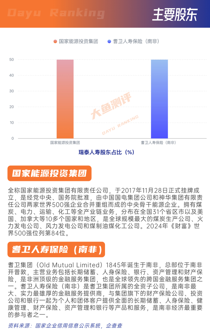 瑞泰人寿 保险有限公司,成立于2004年1月,注册资本18.71亿元,是第一家总部设在北京的合资寿险公司。投资方为中国国电集团国电资本控股有限公司和南非耆卫集团耆卫人寿保险(南非)有限公司。公司成立之初,依托中外方股东的雄厚实力,融合世界500强企业的国际化管理经验,借助外方股东的专业经验,成为国内保险业一家“专注于投连险”的保险公司。公司现已在北京、上海、广东、江苏、浙江、重庆、陕西、湖北等地区经营保险业务。在大鱼系统中的公司实力得分上,目前瑞泰人寿得分为85.64,2024年二季度综合偿付能力为204.82%,表现良好。