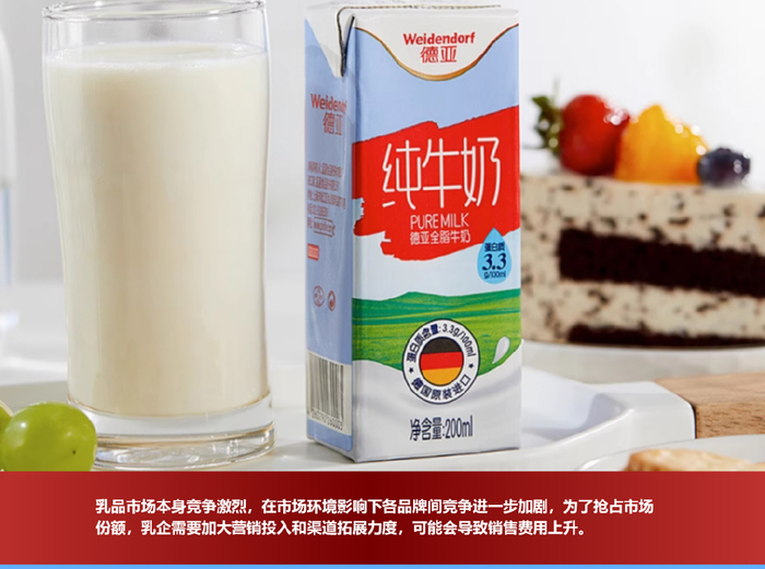 乳品市场本身竞争激烈,在市场环境影响下各品牌间竞争进一步加剧,为了抢占市场份额,乳企需要加大营销投入和渠道拓展力度,可能会导致销售费用上升;而且在竞争激烈环境下,乳企还会采用打折促销、价格战等方式促进销量提升,这也会压缩品牌利润空间,例如某品牌就表示公司下属乳制品生产企业持续加大产品促销力度,使营业利润进一步下降,导致销售额和毛利率同比出现下滑。