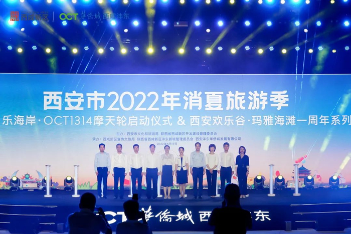 近日,西安市2022年消夏旅游季暨西安欢乐海岸·OCT1314摩天轮启动仪式&西安玛雅海滩水公园开园一周年系列活动在沣东华侨城文旅融合示范区拉开帷幕,西安市副市长肖琦,陕西省文旅厅副厅长郑晓燕,西咸新区管委会主任姜建春,西安市文旅局局长孙超,西安市委宣传部副部长杨丽萍,沣东新城管委会主任姚海军,西咸新区管委会副主任艾晨,深圳华侨城股份公司副总经理、华侨城西部集团党委书记、董事长张大帆,华侨城西部集团总经理、党委副书记张靖,华侨城(西安)发展有限公司相关负责人等出席活动。