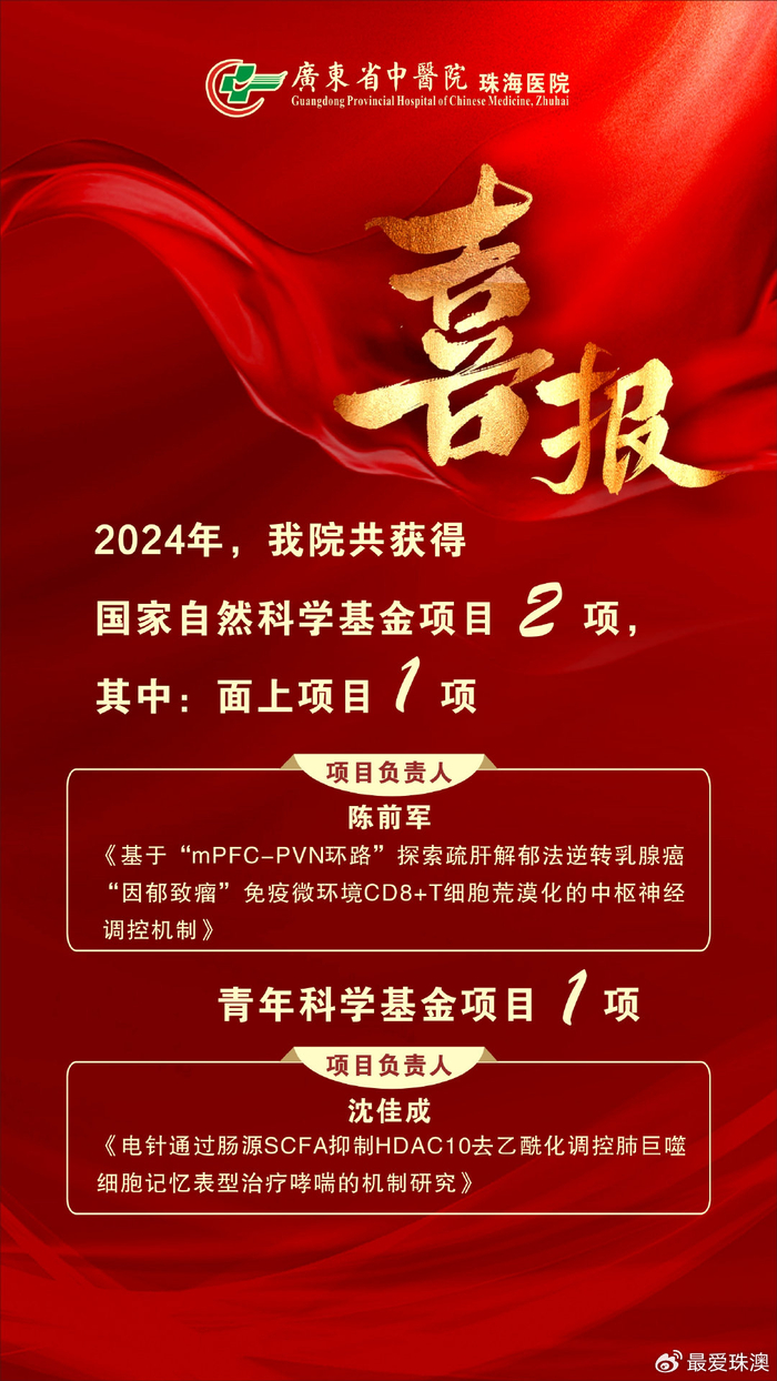 8月23日,国家自然科学基金委员会公布了2024年度国家自然科学基金项目评审结果。广东省中医院珠海医院获批2项,其中面上项目1项、青年科学基金项目1项。