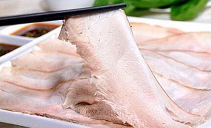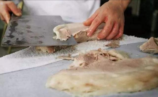 刀工精是指把煮熟的肉从凉开水里捞出用干净的毛巾把肉表面水分吸干,然后在放在垫有干净毛巾的墩子上片成,薄至可以透影的薄肉片,长度要求在20厘米以上,最宽的地方宽度要求在10厘米以上,薄度决不能超过2毫米,所以没有娴熟的刀工是不行的,而垫毛巾是为了防止肉打滑和吸收水分。