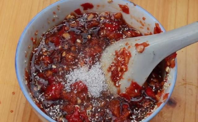 2、将泡好的干辣椒、适量花椒、30克大蒜一起用不管用什么方法捣碎。加入5克生抽、3克白糖、5克香油、5克花椒油、4克鸡精、5克红油、2克盐搅拌均匀备用。