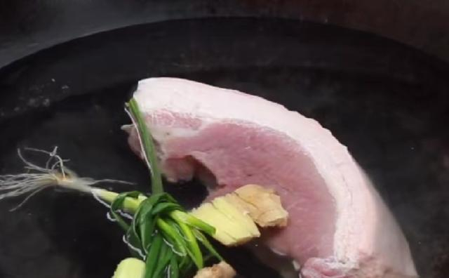 1、买一块新鲜正宗的“二刀肉”清洗干净后,冷水下锅放入大葱、生姜、料酒、适量花椒,大火烧开撇去浮沫。