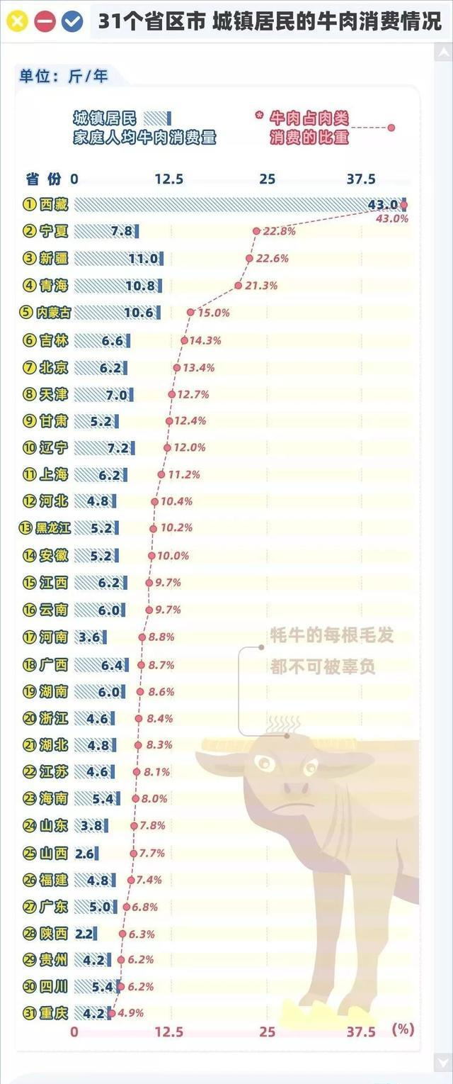 西藏以人均年消费43斤牛肉的“断层优势”稳坐牛肉消费量的头把交椅,高原牦牛撑起了藏食的半边天。
