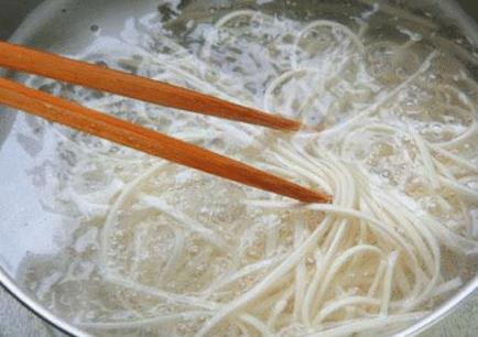 第三步:添加凉水。在面煮沸30秒左右的时候,我们加一小碗的凉水进去,让它继续煮,第二次沸腾之后面条基本上就熟了,这时候我们关火,把面条捞起来用凉水冲洗一下,这样冲洗完之后面条就会收缩变的很有弹性,放个十分钟甚至二十分钟都不会坨。