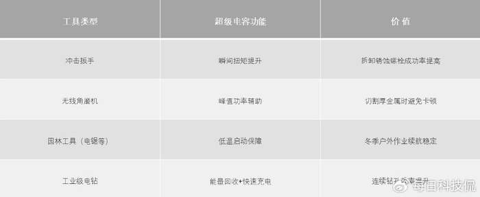 在电动工具领域(如电钻、角磨机、冲击扳手等),瞬时高功率输出与频繁启停的工况对储能器件提出了严苛要求。传统电池受限于充放电速率和循环寿命,难以满足高强度作业需求,而合众汇能全极耳超级电容凭借超低内阻设计与全极耳创新结构,为电动工具动力系统提供了轻量化、高爆发、长寿命的革新解决方案。